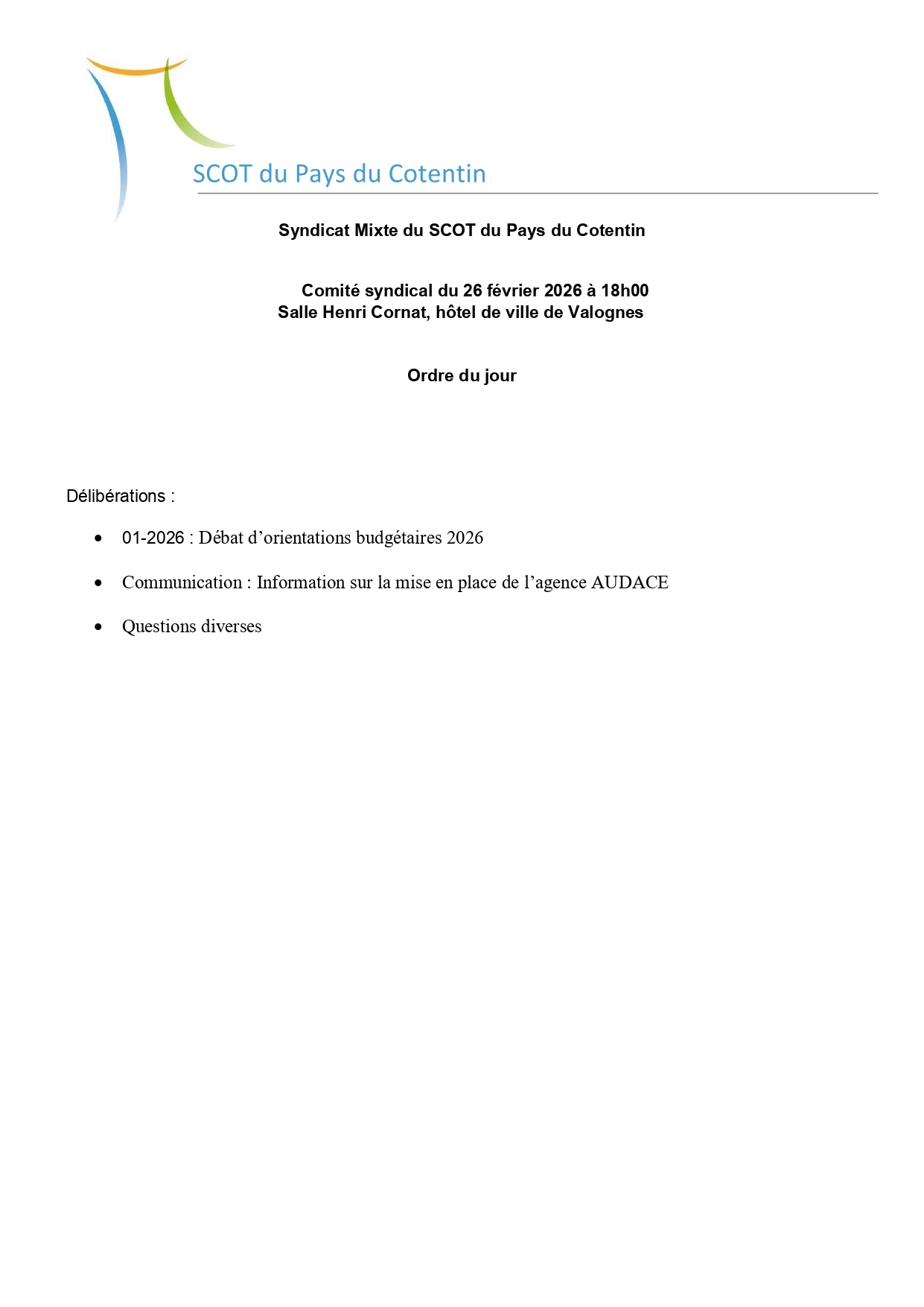 Ordre du jour du Comité Syndical du SCoT du 26 février 2026